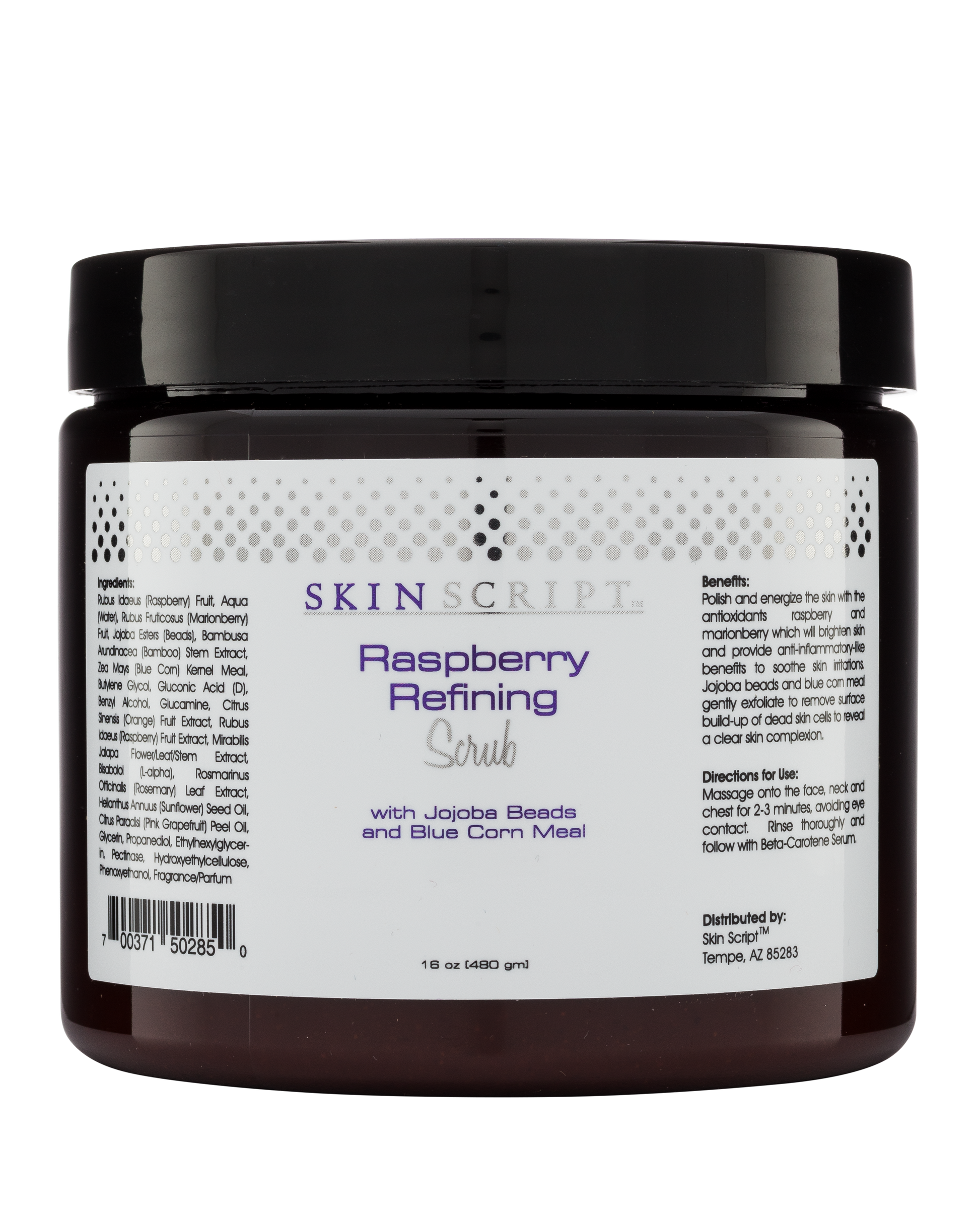 The Raspberry Refining Scrub polishes and energizes the skin with the antioxidants raspberry and marionberry, which brighten skin and provide anti-inflammatory-like benefits to soothe skin irritations. Jojoba beads and blue corn meal gently exfoliate to remove surface build-up and provide physical exfoliation while exfoliating and brightening ingredients work in tandem to promote a clear, healthy skin tone.